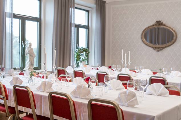 En perfekt lokal för det mindre sällskapet. Planerar ni en studentmottagning, en konfirmation eller ett dop, så passar Röda Salongen utmärkt för dessa tillställningar. Lokalen går i lyxig Gustaviansk stil med moderna textilier i ljusgrått och rött. Salongen rymmer upp till 35 personer. Lokalen är ljus och genom de tre stora fönstren har ni en fantastisk utsikt över Klarälven. Intill finns även två mindre salonger att öppna upp emot.