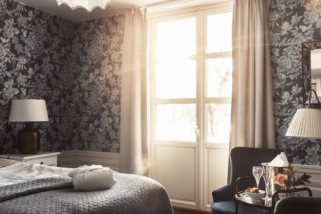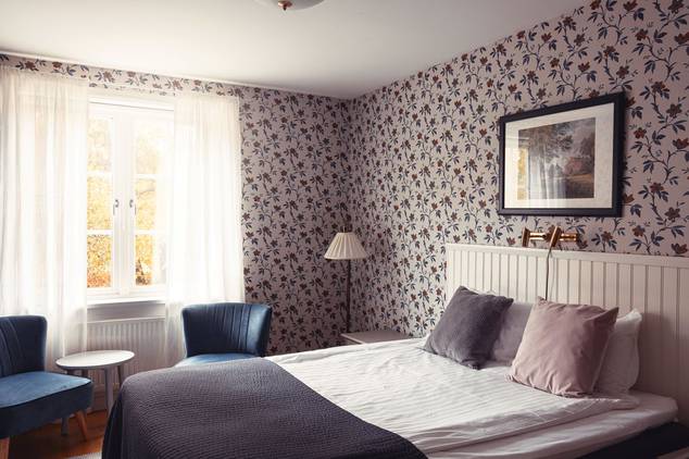 Herrgårdens 59 vackra hotellrum är belägna i tre olika byggnader. Låt dig förföras av den romantiska inredningen med mönstrade tapeter, färgsprakande gardiner och utvalda detaljer. I badrummen erbjuder vi Kerstin Florians lyxiga produkter och utanför fönstret ser du Herrgårdens blomstrande trädgård.