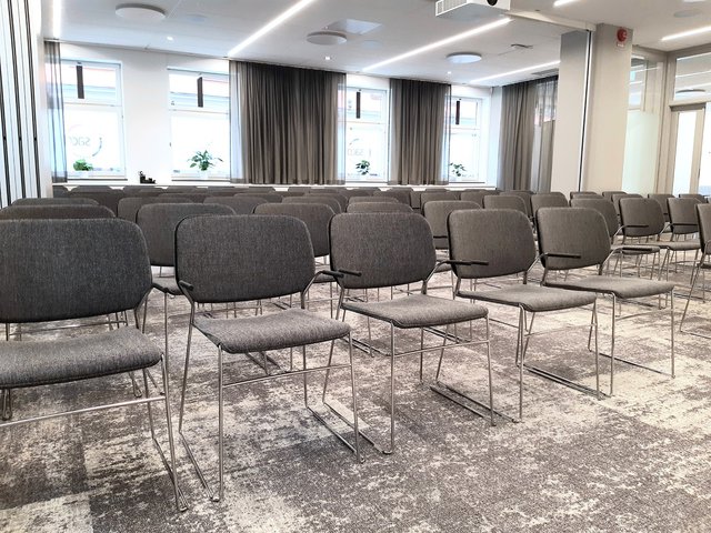 I vår största konferenslokal Gamla Stan kan du ha möte för upp till 72 personer. Flexibel möblering. Kamera som filmar mötesledaren ingår och takmikrofoner borgar för smidiga hybridmöten. Lokalen går att dela av till två mötesrum. Utanför lokalen finns vår lounge med lång soffa och mingelyta.