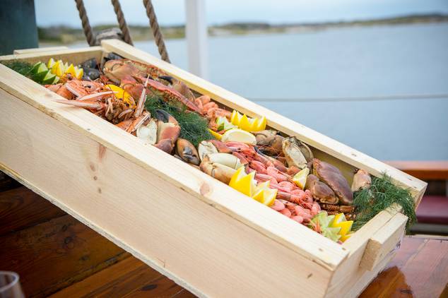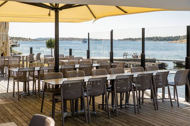 Vid bra väder finns vår uteservering DockSide som är till hälften inglasad med tak, där kan vi anordna middagar nästan under alla årstider, då vi håller det varmt under perioder där vi har det kyligare väder.