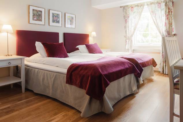Våra sovrum är ljusa och rogivande. Några är större och andra är mindre. De flesta av våra 40 rum ligger i vår röda flygel. Här ligger också fyra deluxe-rum som är inredda i engelskt stil med bubbelbadkar i badrummet och en egen liten uteplats.